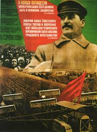Cette affiche de propagande montre que le régime de Staline guide le peuple vers le progrès mais en réalité, ce n’est pas le cas ; le principe de Staline repose sur la collectivisation des terres et le passage à une agriculture modernisée. Selon Staline, l’ensemble de l’économie doit être contrôlé par l’Etat. Il oblige les paysans à entrer dans de grandes fermes collectives (les Kolkhozes), en éliminant la propriété privée paysanne. C’est la collectivisation forcée des terres. Il fait nationaliser les entreprises qui ne l’étaient pas encore. Staline développe la propagande et renforce la terreur. Suite à la terreur Stalinienne, il y a de nombreuses et diverses victimes, comme les Koulaks.